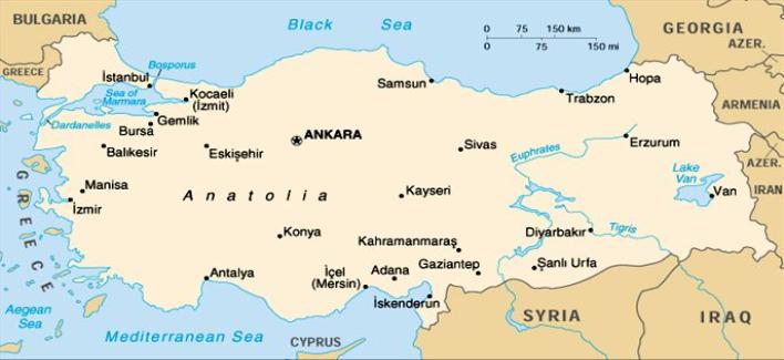 Turkey (Turkey in Turkish) is a country located at a point where the 3 contitinents of the old world (Asia, Africa and Europe) are closest to each other and where Asia and Europe meet. Because of its geographical location, Turkey has always been important throughout history and is the birthplace of many great civilizations.Turkey is surrounded by sea on three sides, by the Black Sea in the north, the Mediterranean in the south and the Aegean Sea in the west. In the northwest there is also an important internal sea, the Sea of Marmara, between the straits of the Dardanelles and the Bosphorus, important waterways that connect the Black Sea with the rest of the world. Click here to read more